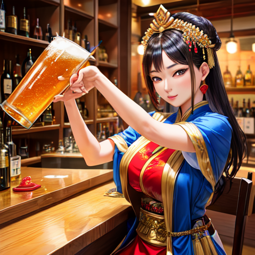 ビールを注いでおすすめしてくれている女性の絵、青髪がとてもきれい、ドラゴンボールのランチさんみたいな感じ