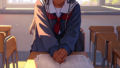 ピンク髪のかわいい女の子が青色のパーカーを着て座っている男性向け2次元萌え画像、下は超ミニスカート